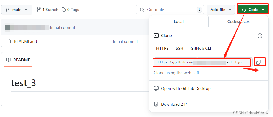 3 ) 在github对应的仓库(repository)(如,test_3)中,“Code”的下拉菜单中,选择复制仓库的URL(如,https://github.com/***/test_3.git),并将该URL填入第2步的VSCode界面对应的输入框中。