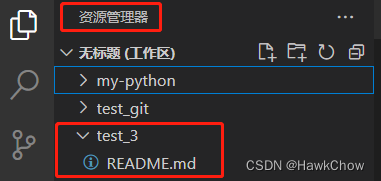 9)选择“添加到工作区”,会发现“源代码管理”和“资源管理器”里面已经有仓库“test_3”的内容(“README.md”作为新建仓库时的文件已经下载到本地的文件夹中)