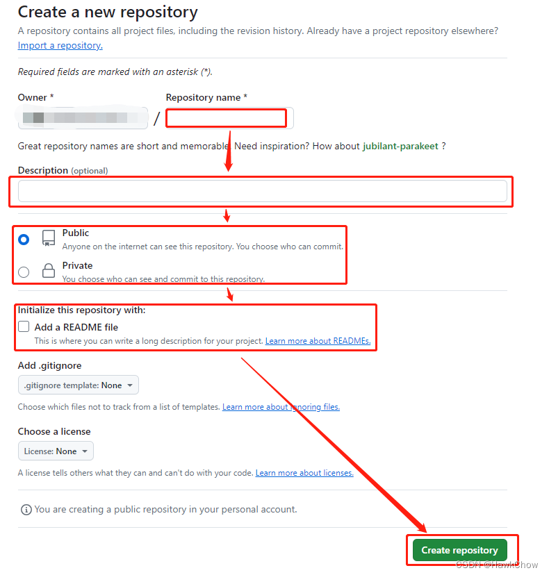 在仓库创建(Create a new repository)页面,逐次对必填项(Repository name)和选填项(Description、Public/Private、Add a README file等)进行设置,然后点击“Create repository”,创建一个新的仓库。
