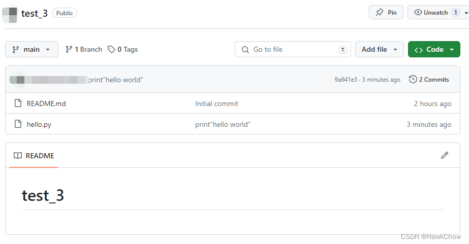 5)刷新GitHub仓库“test_3”所在的网页,会发现我们在本地新建的代码文件已经传递到github上对应的仓库里了。