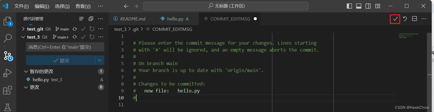 3)在“COMMIT_EDITMSG”中,可以输入文档说明(如在第11行输入 print "hello world"),然后点击右上角的勾√(“接收提交消息”)