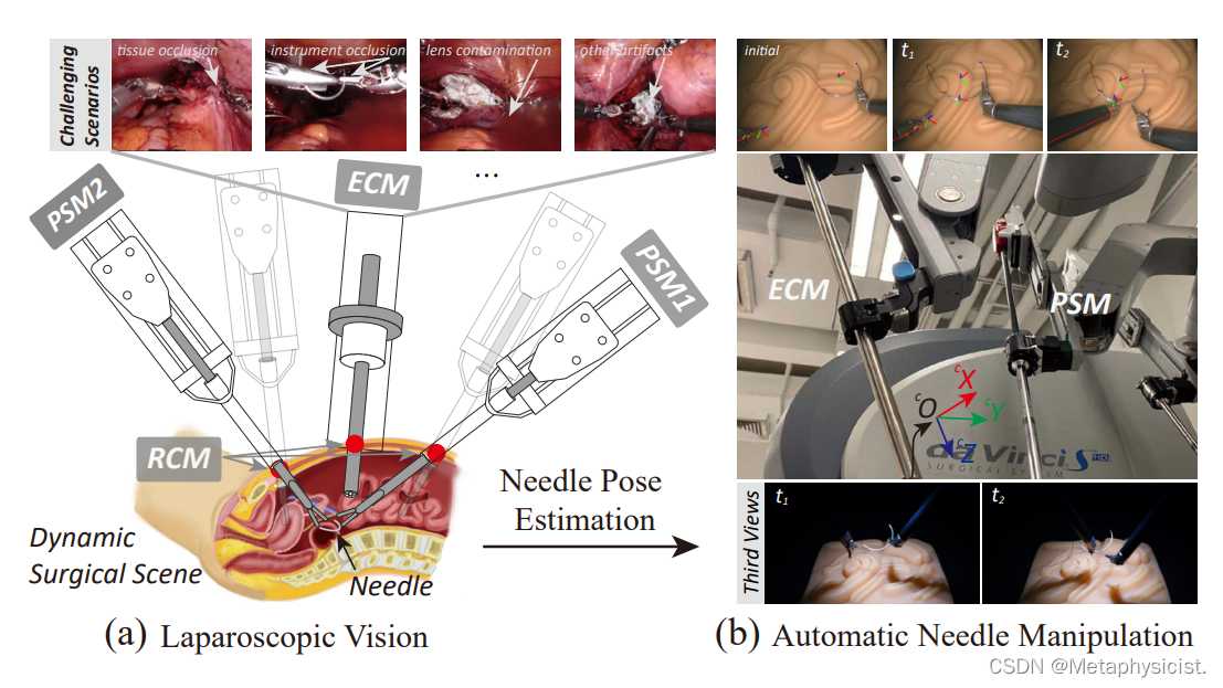 图 1. 实时精确的针位姿估计示意图:动态且具有挑战性的手术场景,可以促进真实操作平台中各种针相关操作的机器人辅助自动化,例如 dVRK 系统中的针通过。