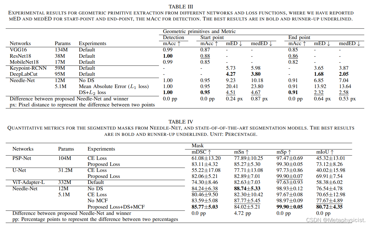 - 对于分割,具有所提出的损失和 MCF 模块的 Needle-Net 实现了最佳性能,平均 DSC 为 85.77%,平均 IoU 为 80.72%,优于 U-Net、PSPNet 和 ViT-Adapter。
