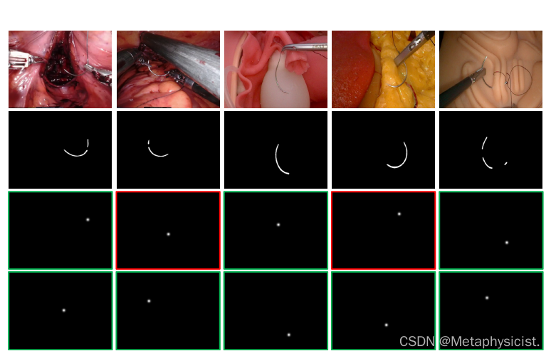 图 6. 来自内部子宫切除术和几个体模的带注释的自我收集图像示例。 从上到下逐行依次是原始图像、掩模、起始关键点热图和结束关键点热图。 热图周围的绿色框表示关联的关键点可见,而红色框表示关联的关键点被遮挡