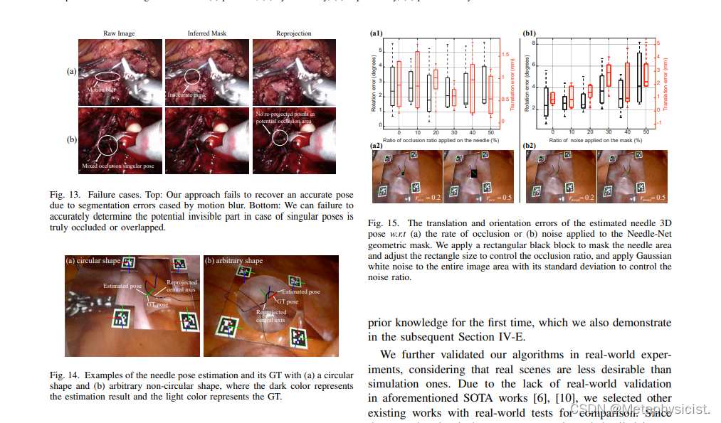 为了提高机器人缝合的效率和可靠性,过去几十年来,研究人员一直关注针具操作的自动化。在临床共识中,自主缝合的核心部分是实时针具姿态估计,因为它为针穿透组织进行伤口闭合时的后续轨迹规划和动作控制提供指导信息。然而,针具姿态估计通常面临的重大挑战是如何在具有挑战性的手术环境中实现高精度,这直接影响到自主缝合的安全性。例如,手术场景中可能包含镜头污染、反射或其他干扰因素。另外,针具的窄长形状,加上可能被组织或器械遮挡,也会阻碍高精度的估计。
