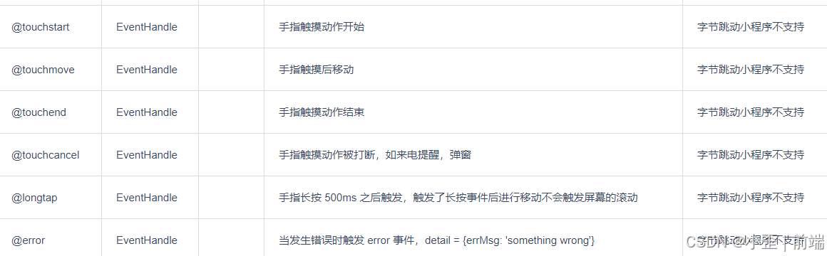 @touchmove | EventHandle | 手指触摸后移动 | 字节跳动小程序不支持 | |