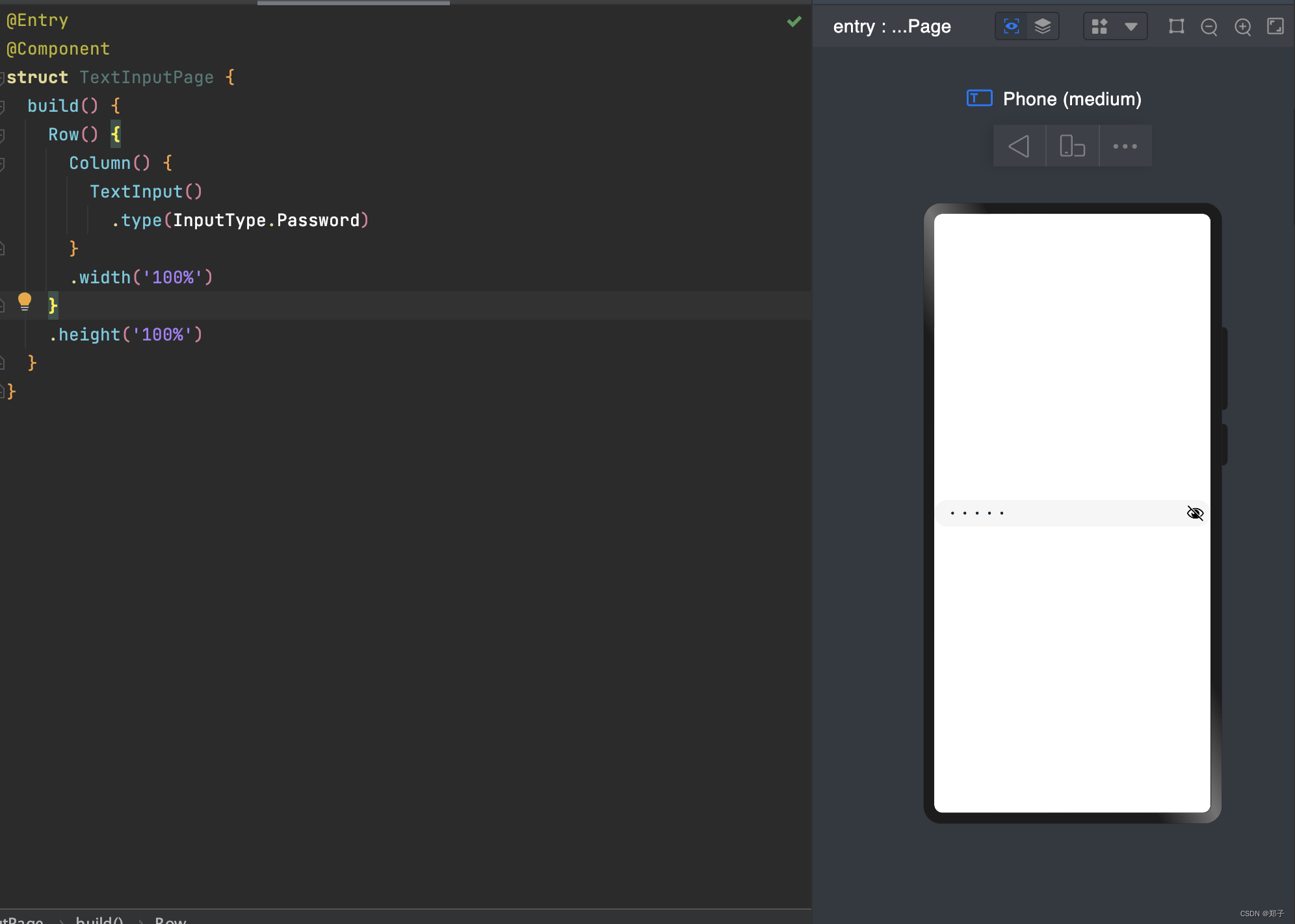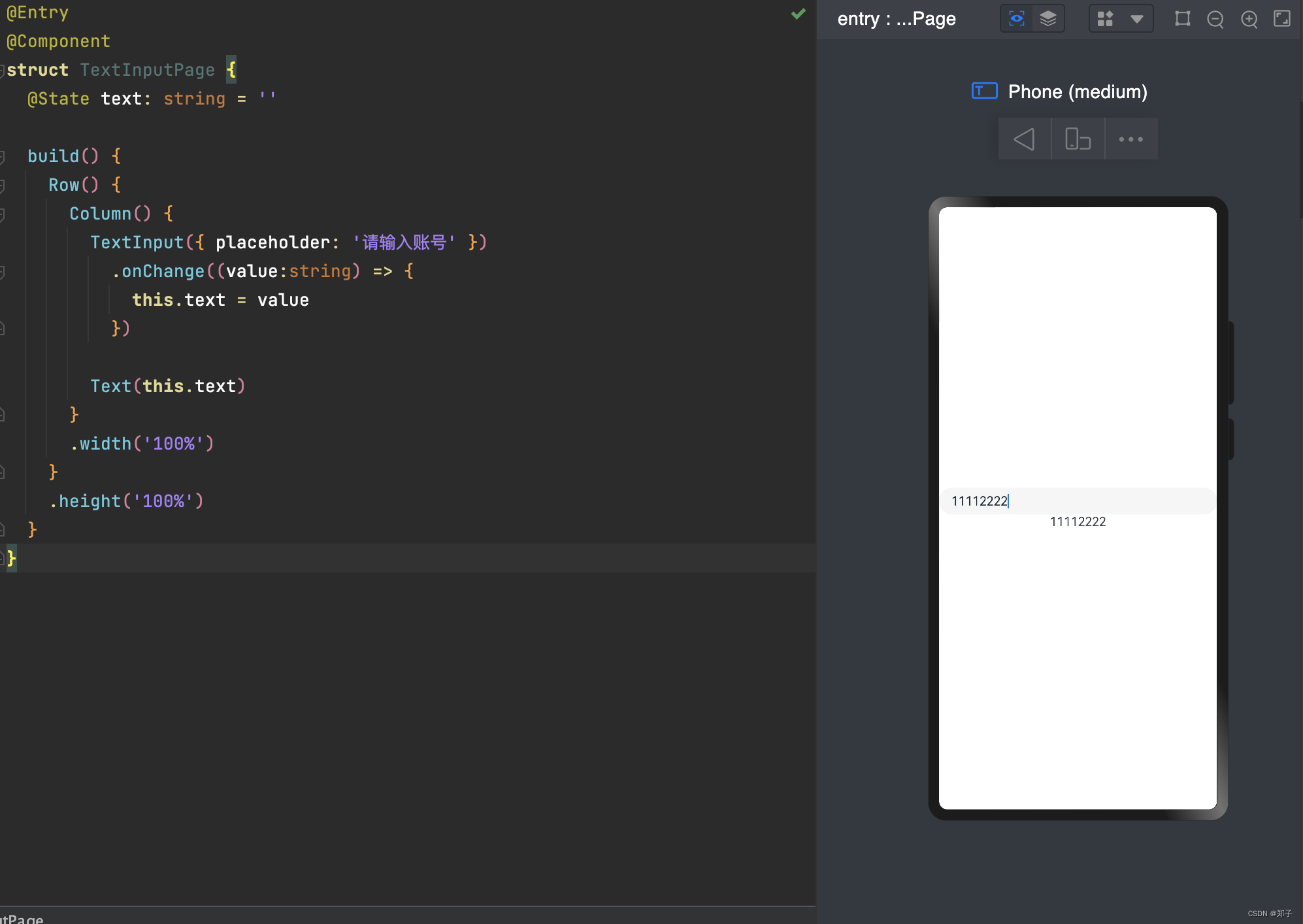 @Entry @Component struct TextInputPage { @State text: string = '' build() { Row() { Column() { TextInput({ placeholder: '请输入账号' }) .onChange((value:string) => { this.text = value }) Text(this.text) } .width('100%') } .height('100%') } }