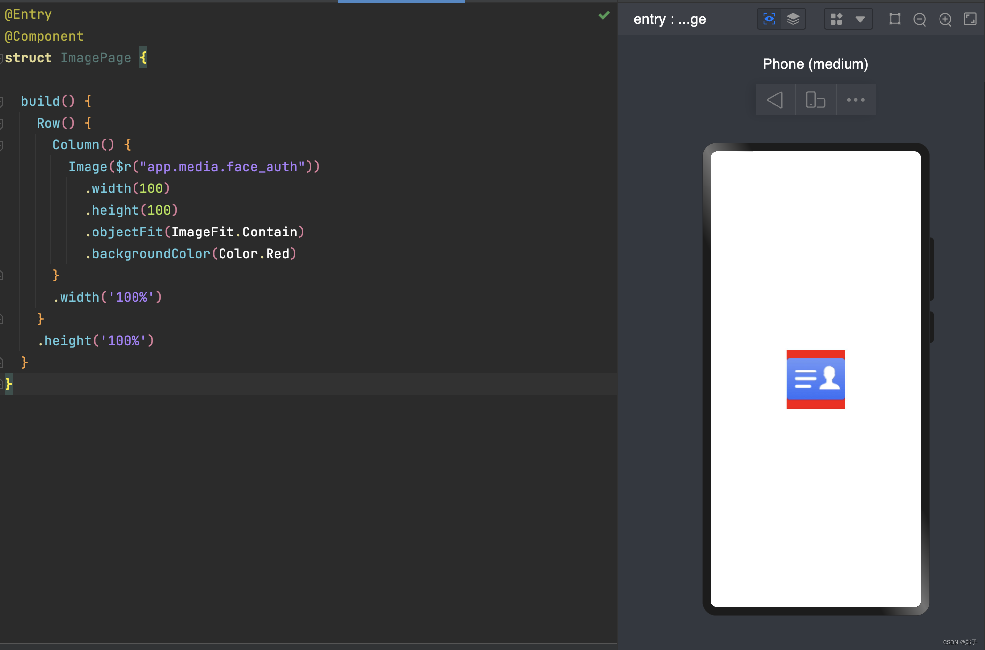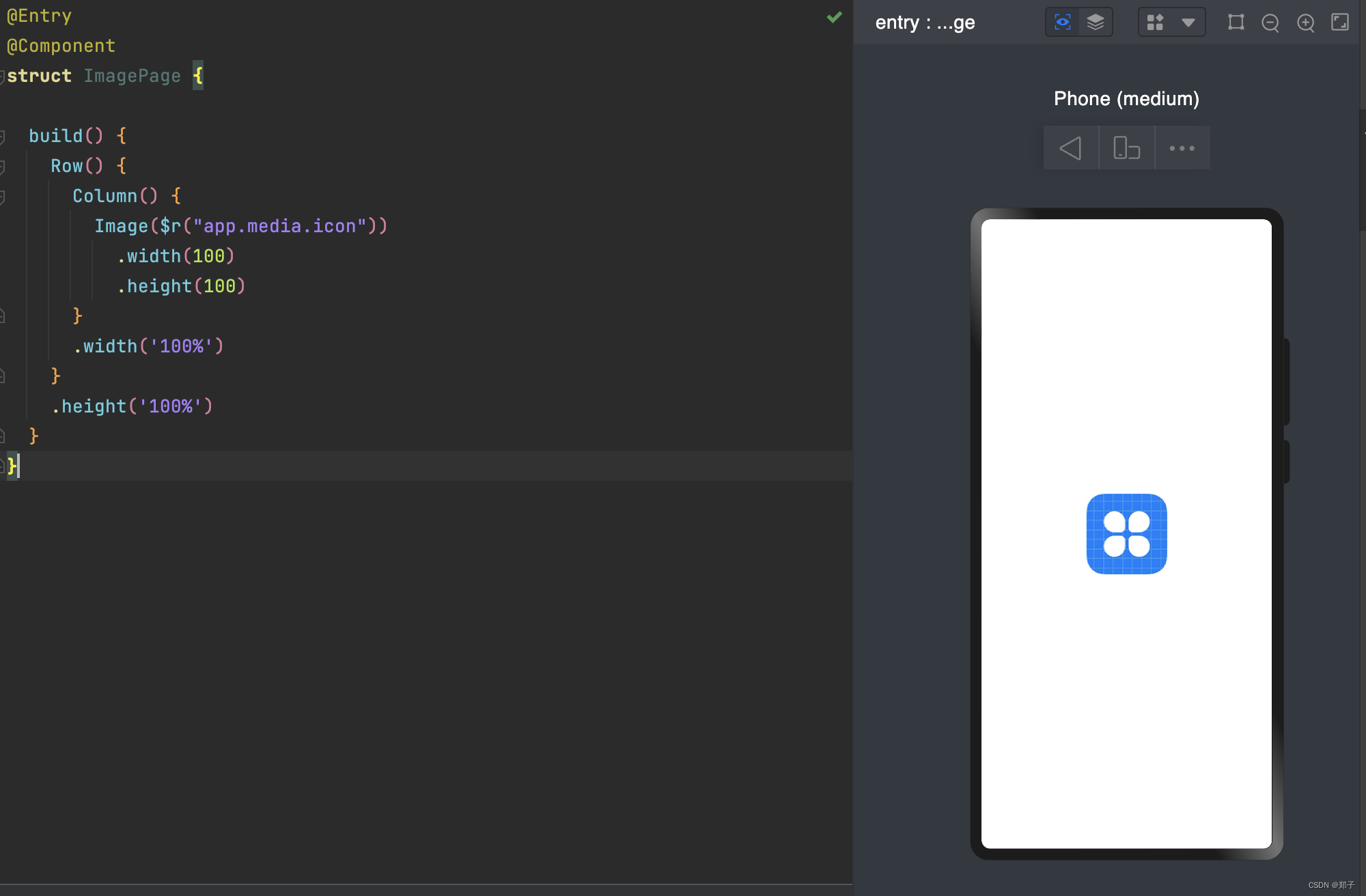@Entry @Component struct ImagePage { build() { Row() { Column() { Image($r("app.media.icon")) .width(100) .height(100) } .width('100%') } .height('100%') } }