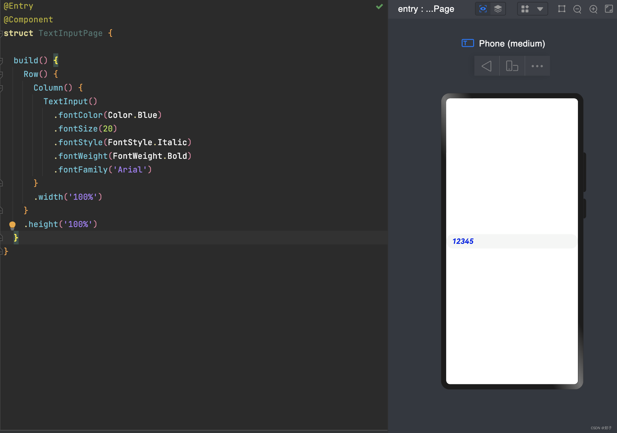 @Entry @Component struct TextInputPage { build() { Row() { Column() { TextInput() .fontColor(Color.Blue) .fontSize(20) .fontStyle(FontStyle.Italic) .fontWeight(FontWeight.Bold) .fontFamily('Arial') } .width('100%') } .height('100%') } }