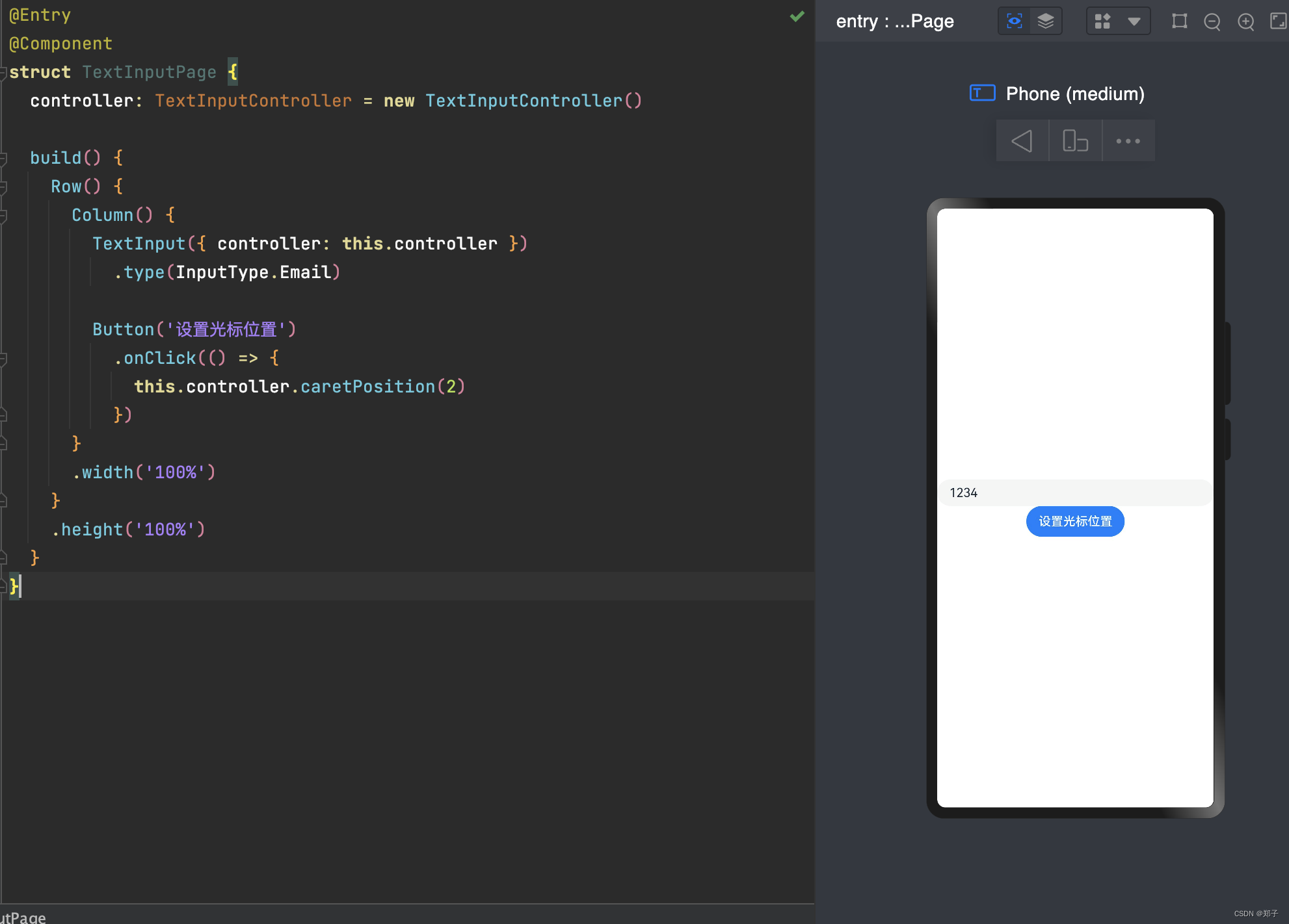 @Entry @Component struct TextInputPage { controller: TextInputController = new TextInputController() build() { Row() { Column() { TextInput({ controller: this.controller }) .type(InputType.Email) Button('设置光标位置') .onClick(() => { this.controller.caretPosition(2) }) } .width('100%') } .height('100%') } }
