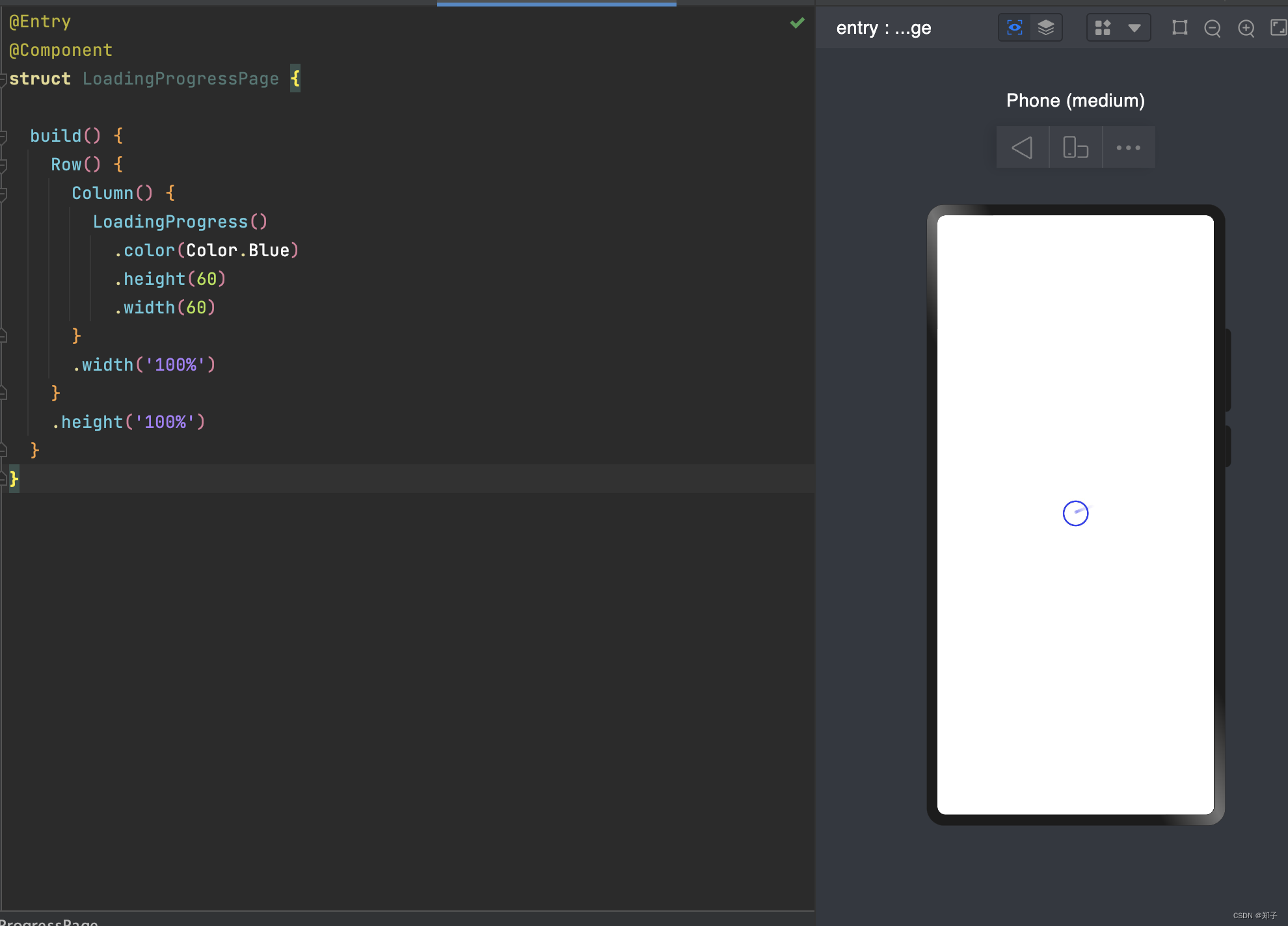@Entry @Component struct LoadingProgressPage { build() { Row() { Column() { LoadingProgress() .color(Color.Blue) .height(60) .width(60) } .width('100%') } .height('100%') } }