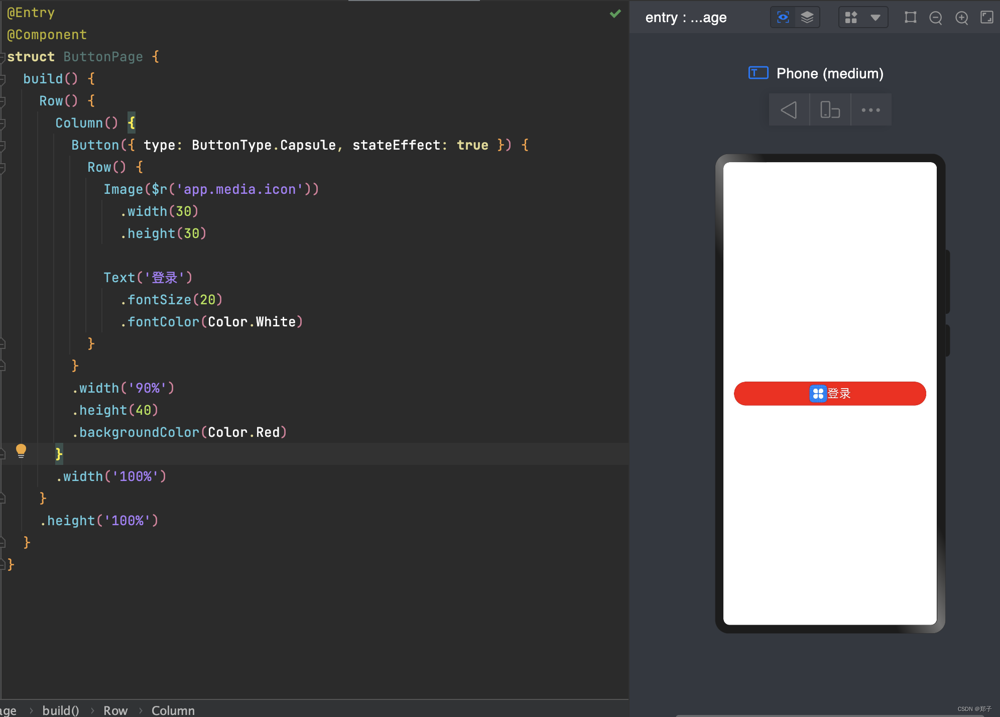 @Entry @Component struct ButtonPage { build() { Row() { Column() { Button({ type: ButtonType.Capsule, stateEffect: true }) { Row() { Image($r('app.media.icon')) .width(30) .height(30) Text('登录') .fontSize(20) .fontColor(Color.White) } } .width('90%') .height(40) .backgroundColor(Color.Red) } .width('100%') } .height('100%') } }