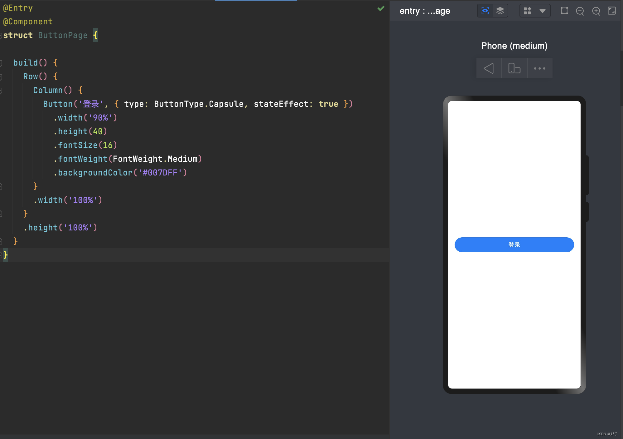 @Entry @Component struct ButtonPage { build() { Row() { Column() { Button('登录', { type: ButtonType.Capsule, stateEffect: true }) .width('90%') .height(40) .fontSize(16) .fontWeight(FontWeight.Medium) .backgroundColor('#007DFF') } .width('100%') } .height('100%') } }