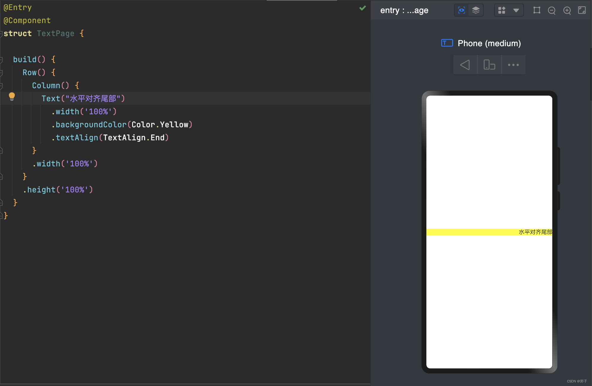 @Entry @Component struct TextPage { build() { Row() { Column() { Text("水平对齐尾部") .width('100%') .backgroundColor(Color.Yellow) .textAlign(TextAlign.End) } .width('100%') } .height('100%') } }
