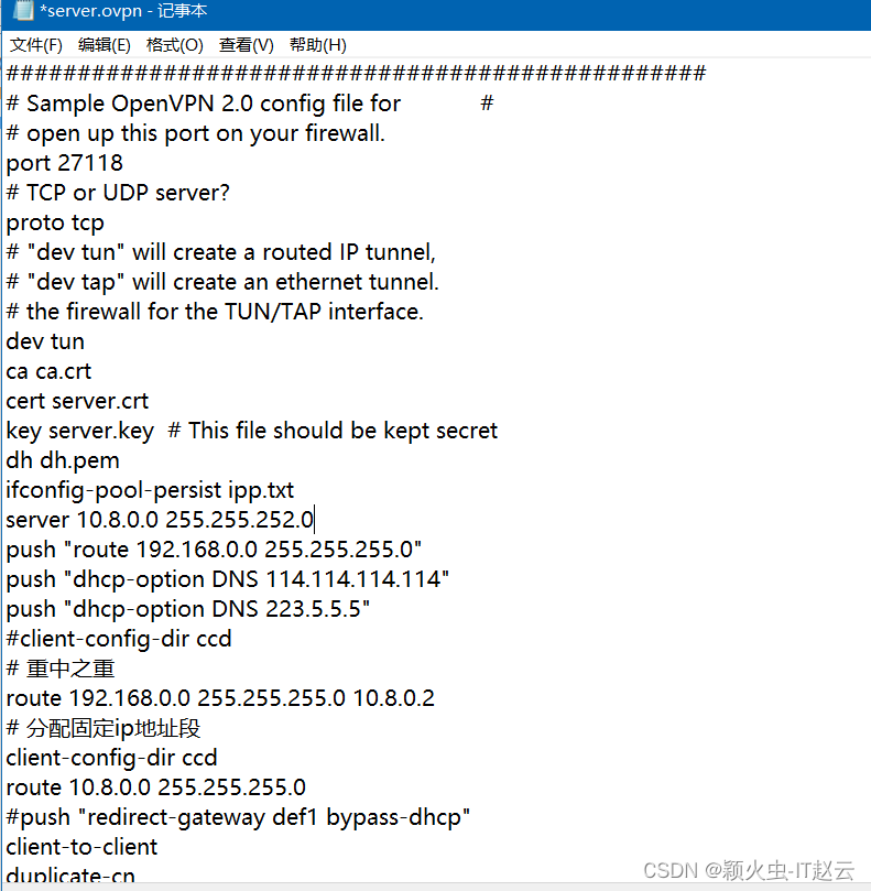 服务端配置文件模板为server.ovpn ,在D:\OpenVPN\open\sample-config目录下。复制server.ovpn文件至D:\OpenVPN\open\config目录下,用windows自带的记事本打开修改为如下配置: