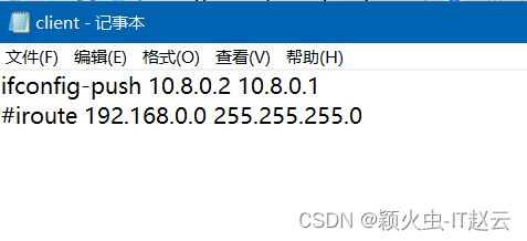 config目录下创建一个ccd文件夹,在文件夹下创建无后缀文件,文件名与客户端证书名一一对应,文件内输入子网段及指定隧道ip如下图所示: