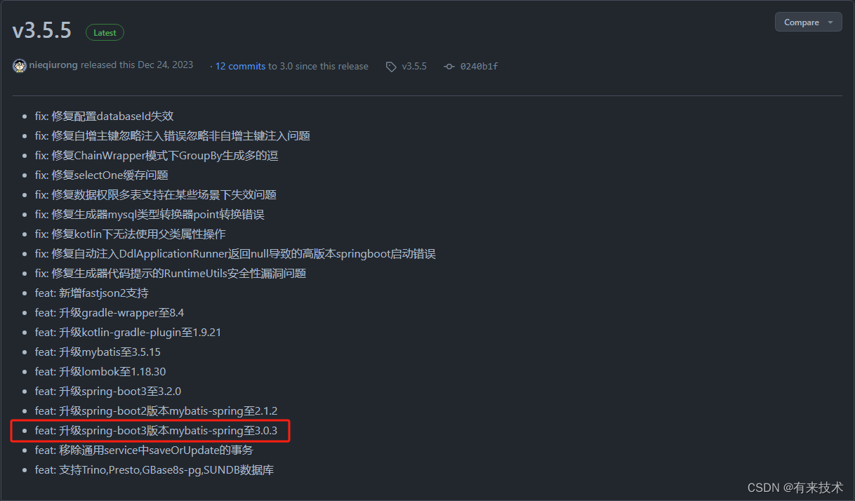 Mybatis-Plus 于 2023年12月24日发布 mybatis-plus v3.5.5 版本,发布日志声明 升级spring-boot3版本mybatis-spring至3.0.3