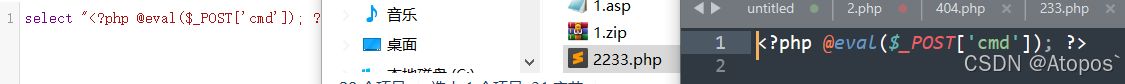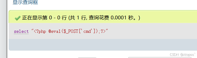 直接查询一个一句话木马select “”;这样日志文件中就会有这个一句话木马的字样,我们去访问日志文件后,就可以进行连接获取shell