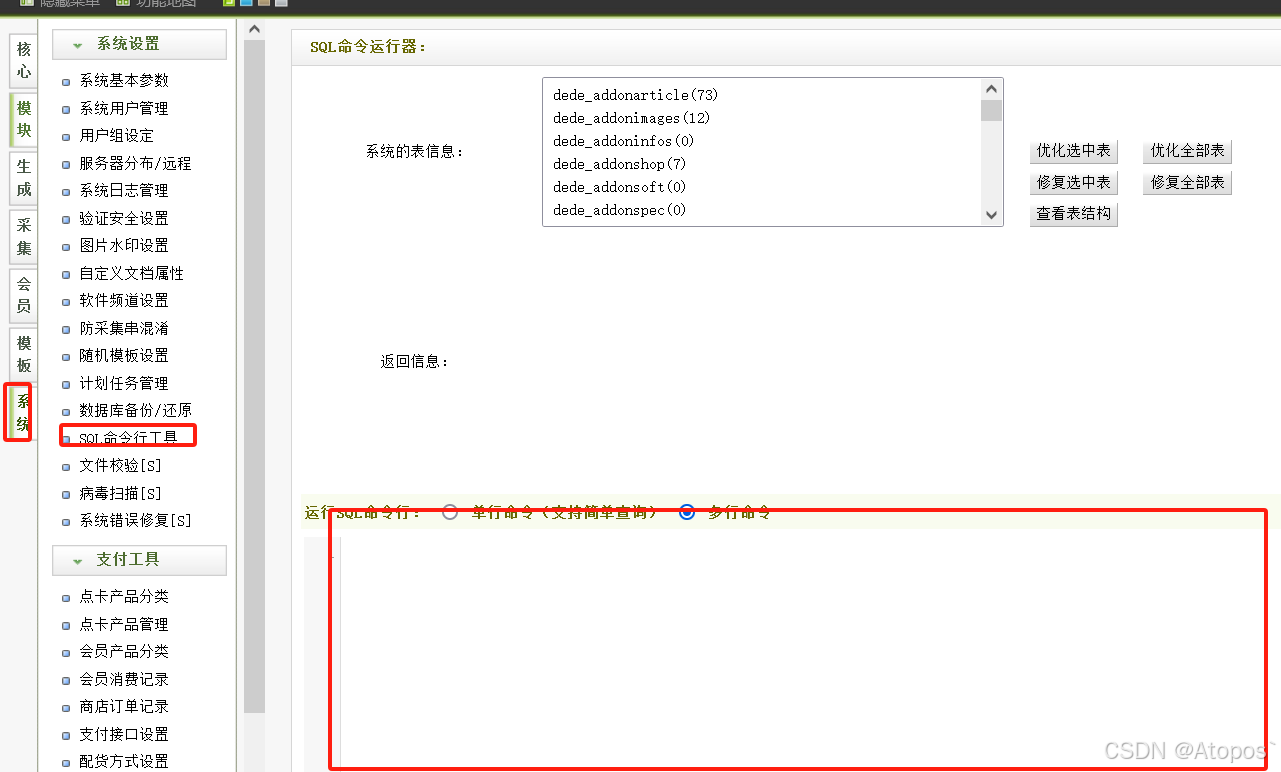 打开系统中的sql命令执行工具,这里可以直接执行sql命令,那么我们就可以利用sql中的into outfile语句写一个一句话木马文件上去,语句如下