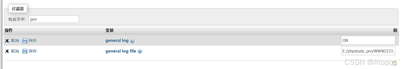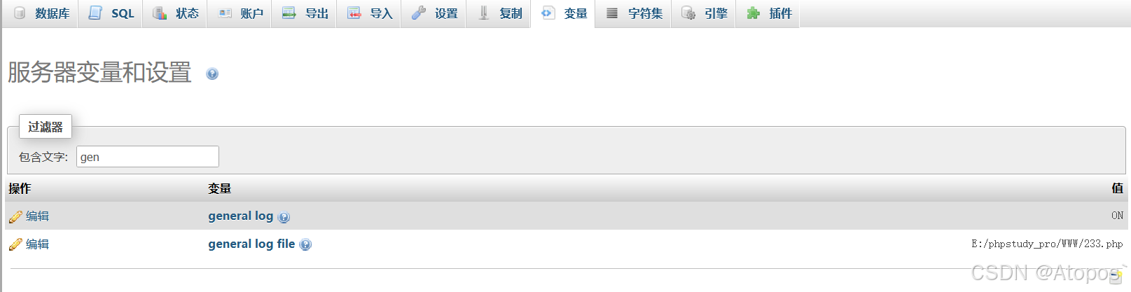 这个⽇志可以在mysql⾥改变它的存放位置,登录phpmyadmin可以修改 这个存放位置,并且可以修改它的后缀名。所以可以修改成php的后缀名就能获取⼀个webshell 。