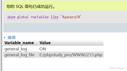 可以修改日志保存文件,我们这里将其保存为网站根目录下的233.php文件,然后再次去show global variables like '%general%'以确认我们的修改生效了,修改成功后,日志文件的后缀就被修改成了php,那么其中的php语句就会被运行