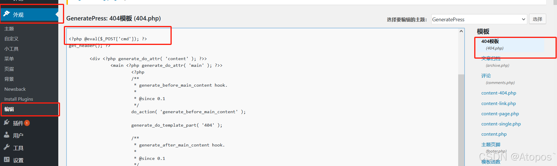 在wordpress的模板中我们可以通过修改模板中的404.php文件,在内容中添加一句话木马,保存后即可访问并拿到shell