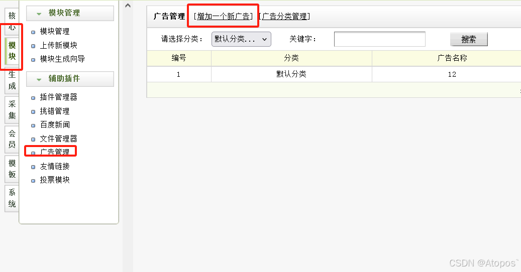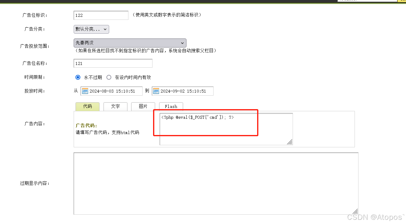 在广告内容的代码中添加一句话木马,别的都随便填,然后点击确定