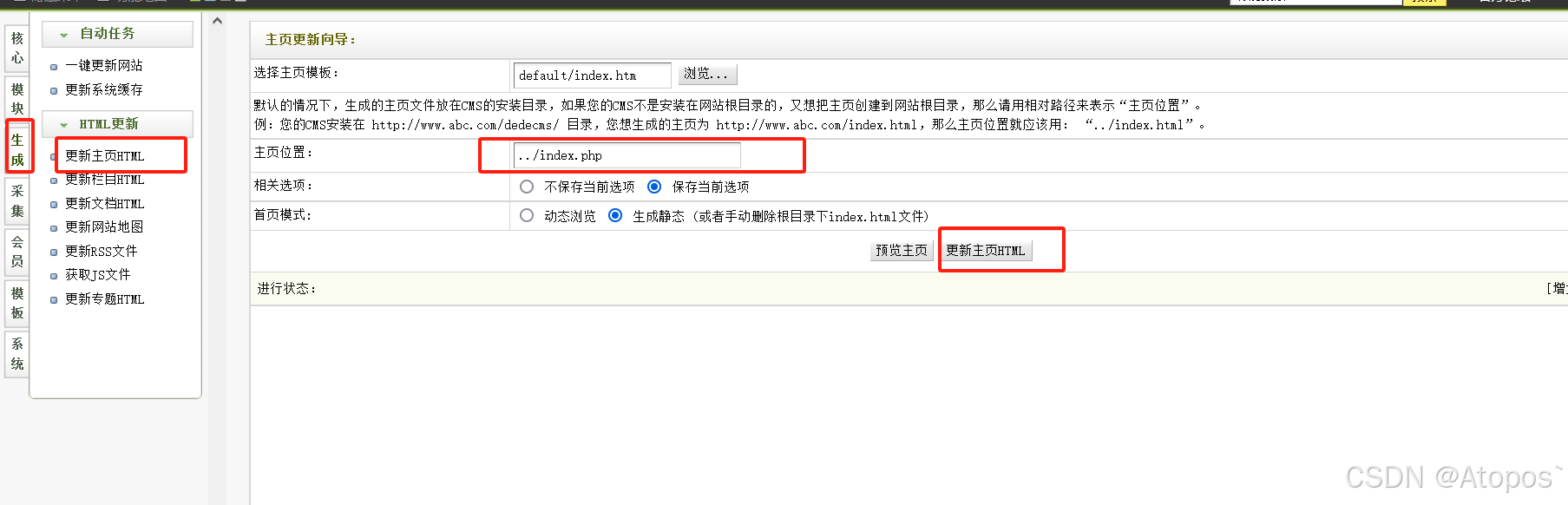进入更新主页html,将主页位置改为index.php,这里改为php后缀,就可以运行内容中的一句话木马了,然后点击更新主页html,点击浏览