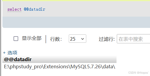 首先我们查询确定一下数据库的位置,利用语句 select @@basedir;查到数据库位置后,就可以大概猜测一下网站的根目录,一般www目录在phpstudt_pro下,是Extensions的同级目录