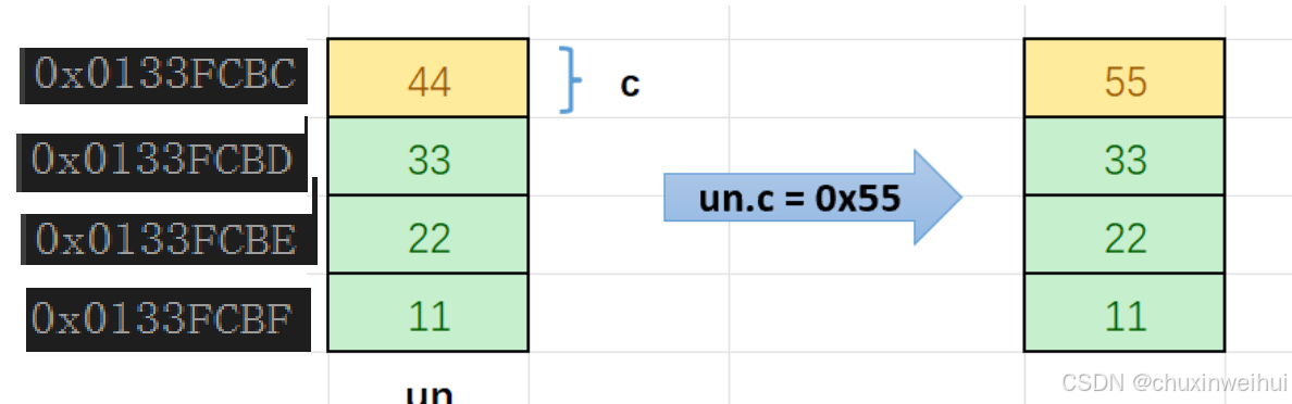 //代码2 #include //联合类型的声明 union Un { char c; int i; }; int main() { //联合变量的定义 union Un un = { 0 }; un.i = 0x11223344; un.c = 0x55; printf("%x\n", un.i); return 0; }