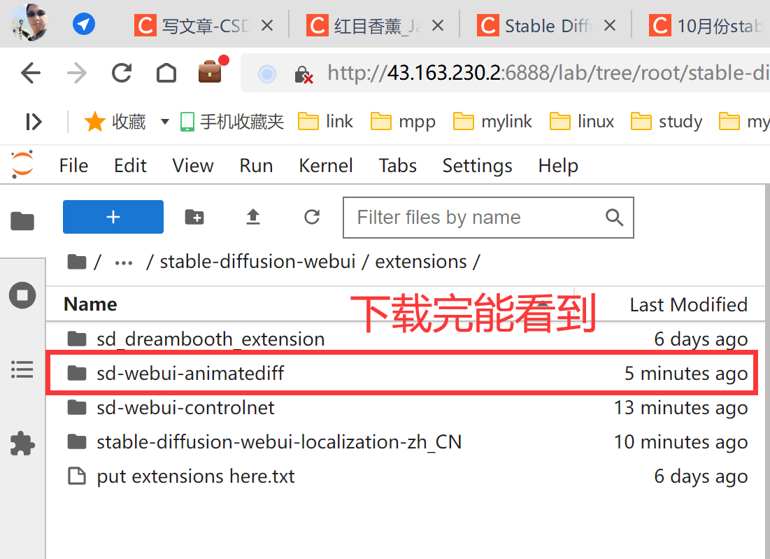 下载完毕后可以在【/root/stable-diffusion-webui/extensions】下看到路径。