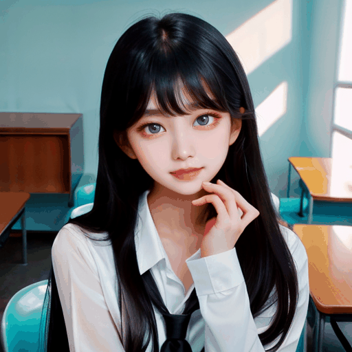 Star face, long black hair, beauty, wearing a white shirt, upper body frontal photo, ultra-clear, cute, lolita, natural black pupils, bright eyes, Chinese style, well-proportioned, regular facial features, no stretching, first love, light blue Color background, tie, campus, desks and chairs, school uniform, long hair to waist, smile, dimples