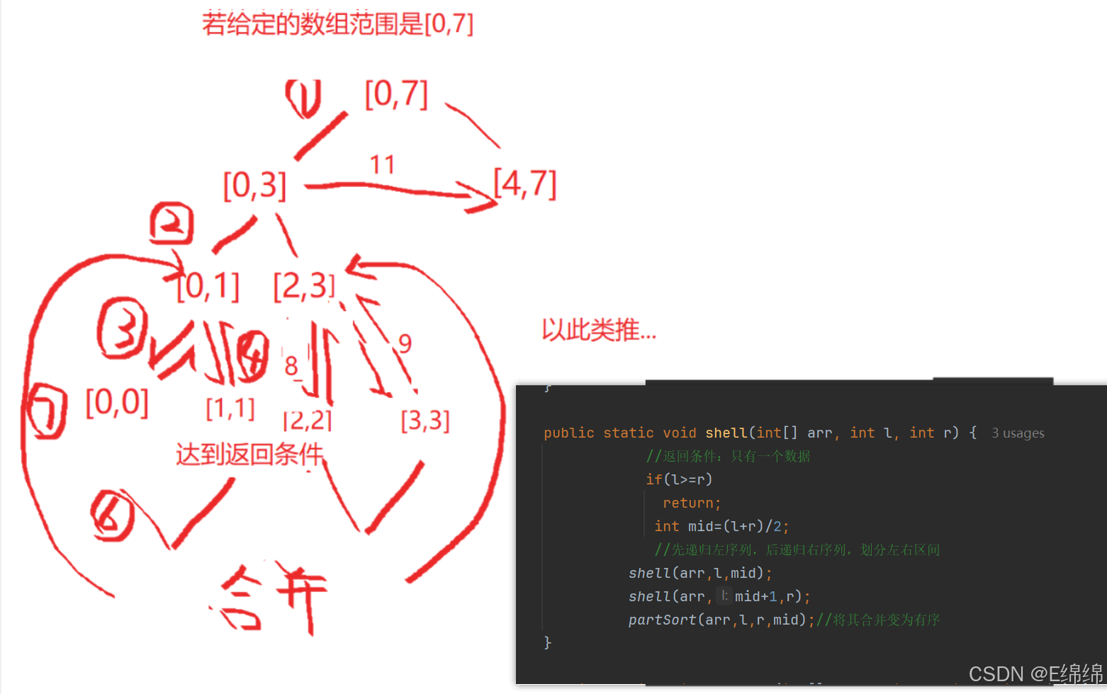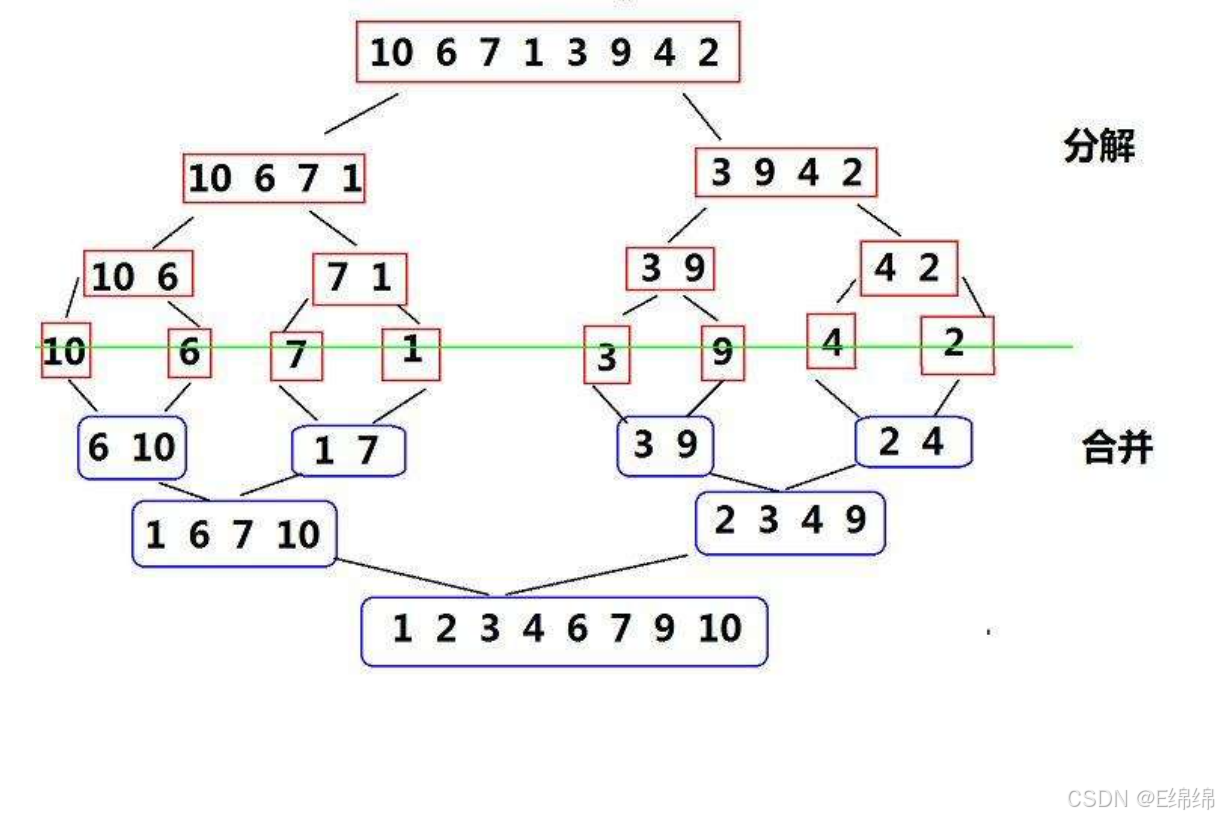 //归并排序 从大往小 递归 public class Sort8 { public static void main(String[] args) { int[] arr = new int[10]; Random random = new Random(); for (int i = 0; i < 10; i++) { arr[i] = random.nextInt(100); } System.out.println(Arrays.toString(arr)); shell(arr, 0, arr.length - 1); System.out.println(Arrays.toString(arr)); } public static void shell(int[] arr, int l, int r) { //返回条件:只有一个数据 if(l>=r) return; int mid=(l+r)/2; //先递归左序列,后递归右序列,划分左右区间 shell(arr,l,mid); shell(arr,mid+1,r); partSort(arr,l,r,mid);//将其合并变为有序 } public static void partSort(int[] arr1, int l, int r,int mid) { int first1=l; int end1=mid; int first2=mid+1; int end2=r; int[] arr2=new int[r-l+1]; int i=0; while(first1<=end1&&first2<=end2) { if(arr1[first1]>=arr1[first2]) { arr2[i]=arr1[first1]; first1++; } else { arr2[i] = arr1[first2]; first2++; } i++; } while (first1<=end1){ arr2[i]=arr1[first1]; first1++; i++; } while (first2<=end2){ arr2[i]=arr1[first2]; first2++; i++; } for (int j = 0; j