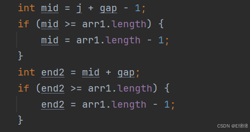 = arr1.length) { mid = arr1.length - 1; } int end2 = mid + gap; if (end2 >= arr1.length) { end2 = arr1.length - 1; } int first2 = mid + 1; int end1 = mid; int[] arr2 = new int[end2 - first1 + 1]; int i = 0; while (first1 <= end1 && first2 <= end2) { if (arr1[first1] >= arr1[first2]) { arr2[i] = arr1[first1]; first1++; } else { arr2[i] = arr1[first2]; first2++; } i++; } while (first1 <= end1) { arr2[i] = arr1[first1]; first1++; i++; } while (first2 <= end2) { arr2[i] = arr1[first2]; first2++; i++; } for (int k = 0; k 如果这非递归思路看起来不好理解的话,大家可以拿纸跟着这个代码一步一步去走,这样就比较容易理解了。