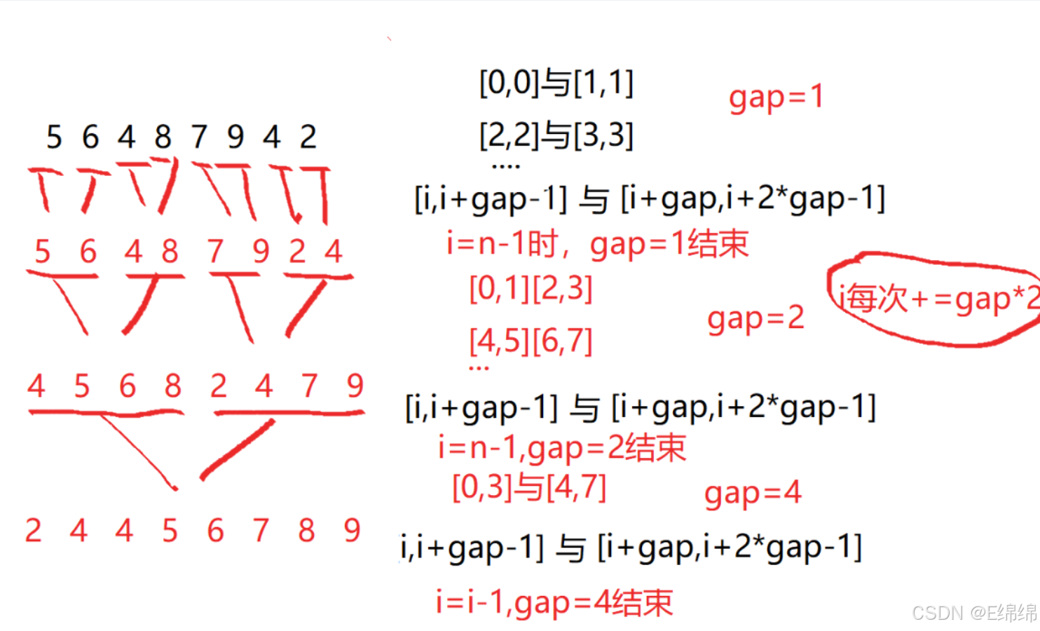 递归搞明白了,非递归其实也一样,无非就是控制合并两个有序数组时数组的范围从小到大一步一步变成有序