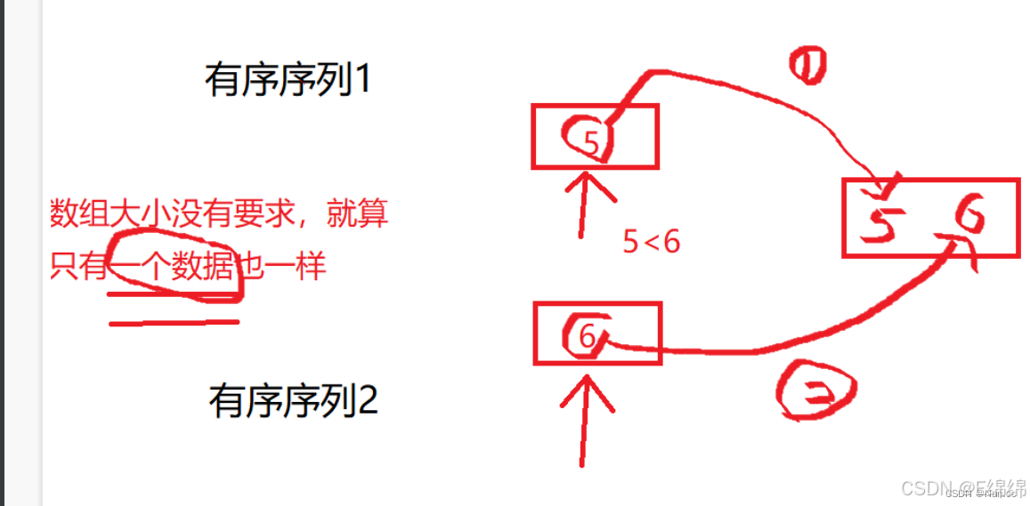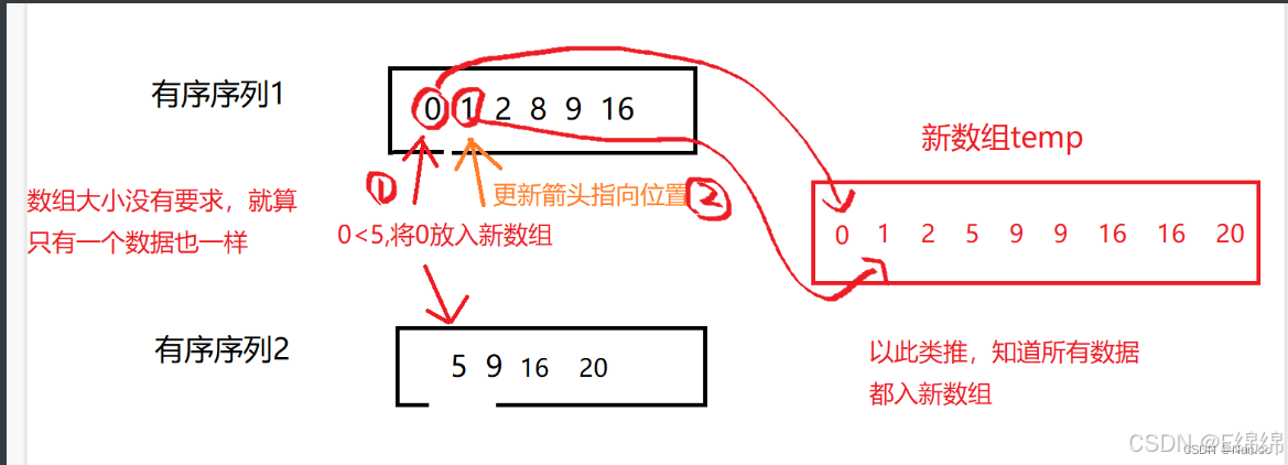 假如现在有两个有序序列让你排序,应该自然会想到合并两个有序子序列,也就是新开辟一块空间,并依次比较分别比较两个子序列的大小然后放入新空间中,如下图