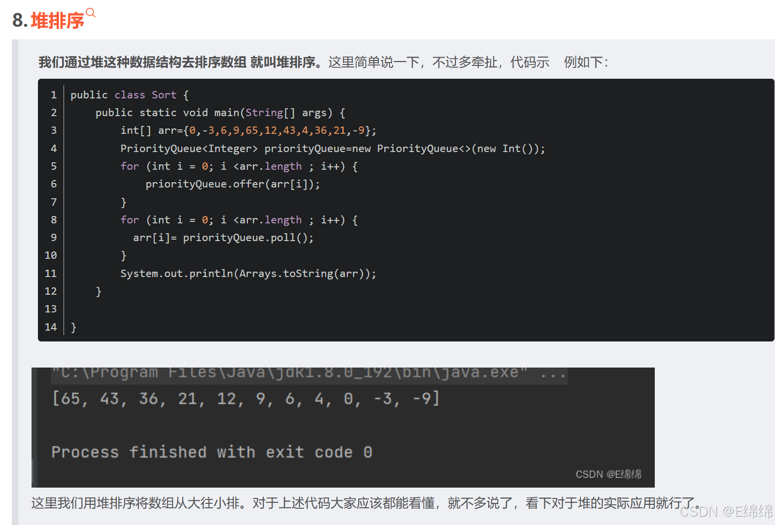 对于大家普遍认为的堆排序,都是自己模拟一个堆,而后再模拟实现向上转型,从而排序好,我个人认为过于麻烦。我们可以直接使用PriorityQueue去创建堆而后使用其中自带的方法去完成排序,就没有这么麻烦,并且达到一样的效果。