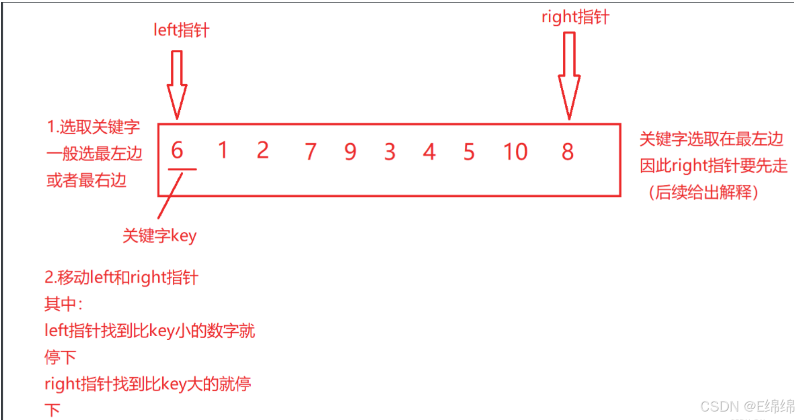 我们知道,left指针是去找大于key的数,因此停下来的位置的值一定比key大,若左边先出发,右边后出发且此时相遇了,那么相遇点的值一定是大于key的值,此时再交换,则达不到key的左右两边要么大要么小的目的。因此我们要保证提前相遇的位置与key交换后是想要的效果,若最左边做key,则右边先走,最右边做key则左边先走。