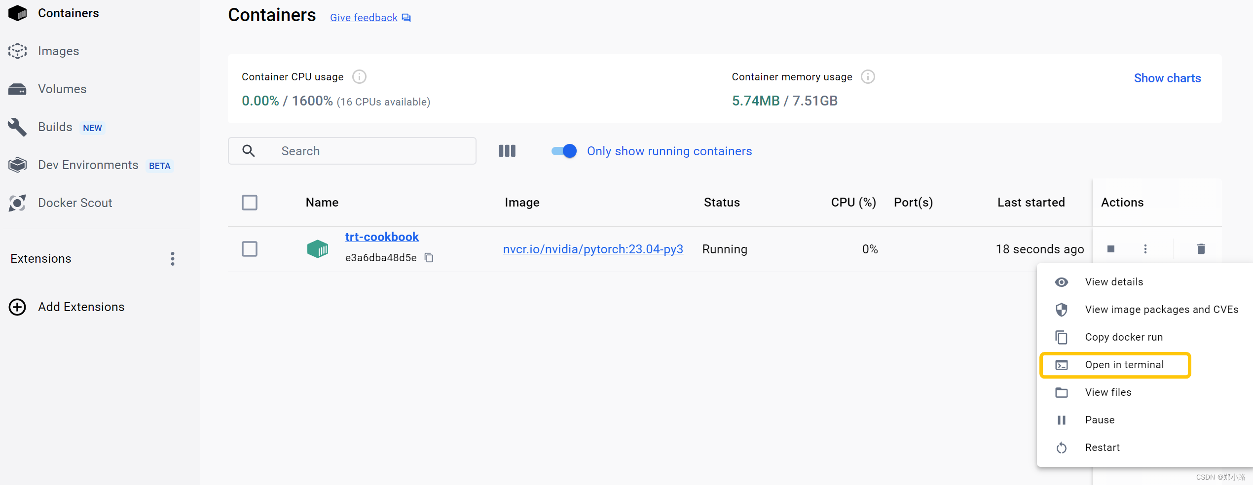 当上一步的命令运行完成,可以在docker的Containers目录下看到一个trt-cookbook容器,点击Open in terminal 即可在终端使用该容器。