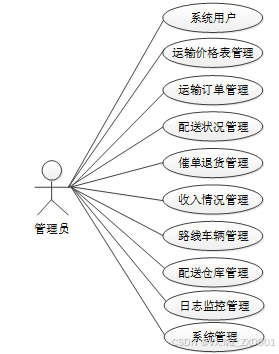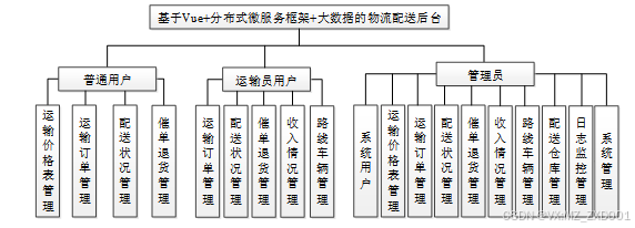 物流配送后台系统可以划分为注册普通用户、运输员用户和管理员模块三大部分。
