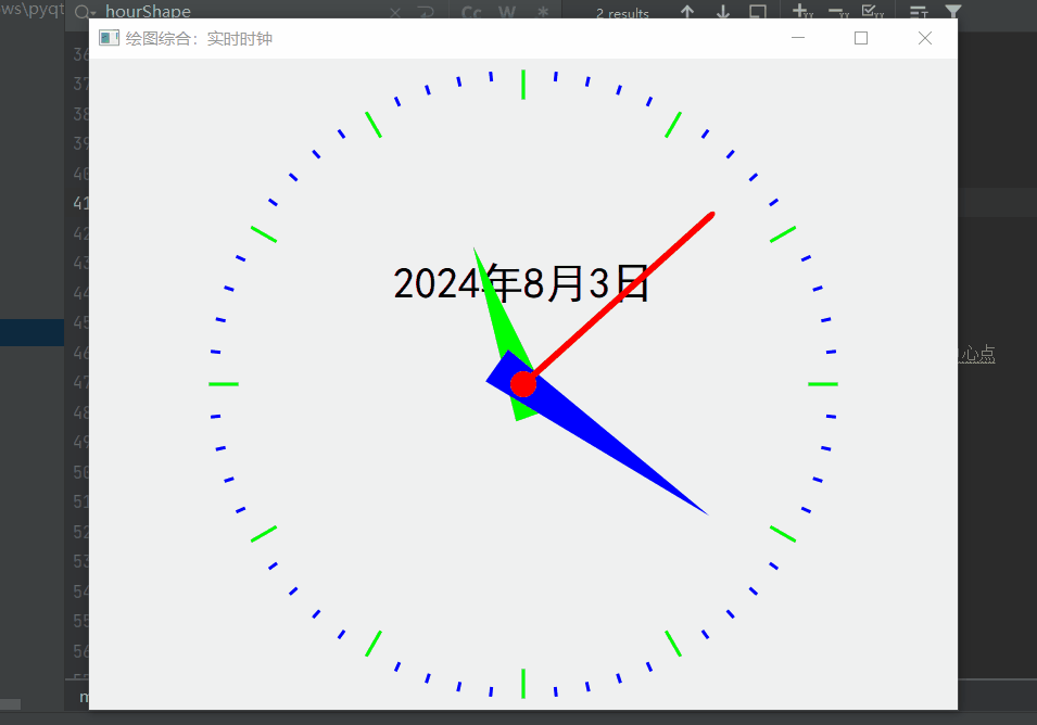 # -*- coding:utf-8 -*- """ ------------------------------------------------ File Name: 时钟.py Description: Author: lzq date:2024-08-03 10:17 ------------------------------------------------ """ import sys from PyQt6.QtCore import Qt, QPoint, QTime, QTimer,QDate,QRect from PyQt6.QtGui import QColor, QPainter, QPolygon,QFont, QRegion from PyQt6.QtWidgets import QApplication, QWidget class myClock(QWidget): # 时针形状 hourShape = QPolygon([QPoint(6,10),QPoint(-6,10),QPoint(0,-45)]) # 分针形状 minuteShape = QPolygon([QPoint(6,10),QPoint(-6,10),QPoint(0,-70)]) # 时分秒针颜色 hourColor = QColor(0, 255, 0) minuteColor = QColor(0, 0, 255) secondColor = QColor(255, 0, 0) def __init__(self): super().__init__() self.setWindowTitle('绘图综合:实时时钟') # 创建定时器, 每秒刷新 timer = QTimer(self) timer.timeout.connect(self.update) timer.start(1000) def paintEvent(self, event): time = QTime.currentTime() date = QDate.currentDate() year=date.year() month = date.month() day=date.day() ymd=str(year)+'年'+str(month)+'月'+str(day)+'日' rect= QRect(220,150,200,30) painter = QPainter(self) painter.setFont(QFont('黑体',24)) painter.drawText(rect,Qt.AlignmentFlag.AlignCenter,ymd) painter.setRenderHint(QPainter.RenderHint.Antialiasing) #抗锯齿 side = min(self.width(), self.height()) painter.translate(self.width()/2, self.height()/2) #平移到窗口中心点 painter.scale(side/200.0, side/200.0) # 缩放比例 # 绘制小时刻度 painter.setPen(myClock.hourColor) for i in range(12): painter.drawLine(88, 0, 96, 0) painter.rotate(30.0) # 绘制分针刻度 painter.setPen(myClock.minuteColor) for j in range(60): if (j % 5) != 0: painter.drawLine(94, 0, 96, 0) painter.rotate(6.0) # 绘制时针 painter.setPen(Qt.PenStyle.NoPen) painter.setBrush(myClock.hourColor) painter.save() painter.rotate(30.0 * ((time.hour() + time.minute() / 60.0))) # 旋转时针到正确位置 painter.drawPolygon(myClock.hourShape) painter.restore() # 绘制分针 #painter.setPen(Qt.PenStyle.NoPen) painter.setBrush(myClock.minuteColor) painter.save() painter.rotate(6.0 * (time.minute() + time.second() / 60.0)) painter.drawConvexPolygon(myClock.minuteShape) painter.restore() # 绘制秒针 painter.setPen(Qt.PenStyle.NoPen) painter.setBrush(myClock.secondColor) painter.drawEllipse(-4, -4, 8, 8) painter.save() painter.rotate(6.0 * time.second()) painter.drawRoundedRect(-1, -1, 80, 2, 2, 2) painter.restore() # def resizeEvent(self, event): # w = self.width() # h = self.height() # side = min(w, h) # # 为窗口设置一个圆形遮罩 # maskedRegion = QRegion(w/2 - side/2, h/2 - side/ 2, side, side, QRegion.RegionType.Ellipse) # self.setMask(maskedRegion) if __name__ == '__main__': app = QApplication(sys.argv) w = myClock() w.show() sys.exit(app.exec())