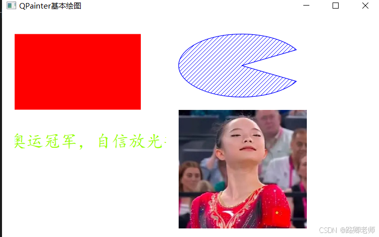 import sys from PyQt6.QtWidgets import QApplication, QWidget from PyQt6.QtCore import Qt, QRect from PyQt6.QtGui import (QPainter, QPen, QBrush, QPalette, QColor, QFont, QImage) class myWidget(QWidget): def __init__(self, parent=None): super().__init__(parent) self.setPalette(QPalette(Qt.GlobalColor.white)) # 设置窗口背景颜色为白色 self.setAutoFillBackground(True) self.resize(600, 360) self.setWindowTitle("QPainter基本绘图") def paintEvent(self, event): # 在窗口上绘图 painter = QPainter(self) # 设置图形和文本抗锯齿 painter.setRenderHint(QPainter.RenderHint.Antialiasing) painter.setRenderHint(QPainter.RenderHint.TextAntialiasing) # 设置画笔 pen = QPen() pen.setWidth(3) # 线宽3像素 pen.setStyle(Qt.PenStyle.DotLine) # 虚线 # painter.setPen(pen) painter.setPen(Qt.PenStyle.NoPen) # 设置画刷 brush = QBrush() brush.setColor(Qt.GlobalColor.red) brush.setStyle(Qt.BrushStyle.SolidPattern) # 填充样式 painter.setBrush(brush) # 绘图 rect = QRect(20, 30, 200, 120) painter.drawRect(rect) # 设置画笔线宽为1像素,线型为实线,颜色为红色 pen.setWidth(1) # 线宽1像素 pen.setStyle(Qt.PenStyle.SolidLine) # 实线类型 pen.setColor(Qt.GlobalColor.blue) # 红颜色 painter.setPen(pen) # 设置刷子颜色为蓝色,并设置填充样式为对角线模式 brush.setColor(Qt.GlobalColor.blue) brush.setStyle(Qt.BrushStyle.BDiagPattern) # 填充样式 painter.setBrush(brush) # 使用新的画笔和刷子绘制一个扇形,其圆心位于(280, 30),半径分别为200和100,起始角度为30度,结束角度为300度 painter.drawPie(280, 30, 200, 100, 30 * 16, 300 * 16) rect = QRect(20, 150, 240, 100) text = "我是奥运冠军,自信放光芒~!" pen.setColor(QColor(150, 255, 3)) painter.setPen(pen) painter.setFont(QFont('楷体', 20)) # 设置字体 painter.drawText(rect, Qt.AlignmentFlag.AlignCenter, text) image = QImage("./images/ticao.jpg") rect = QRect(280, 150, int(image.width() * 0.5), int(image.height()* 0.5)) painter.drawImage(rect, image) if __name__ == "__main__": app = QApplication(sys.argv) w = myWidget() w.show() sys.exit(app.exec())