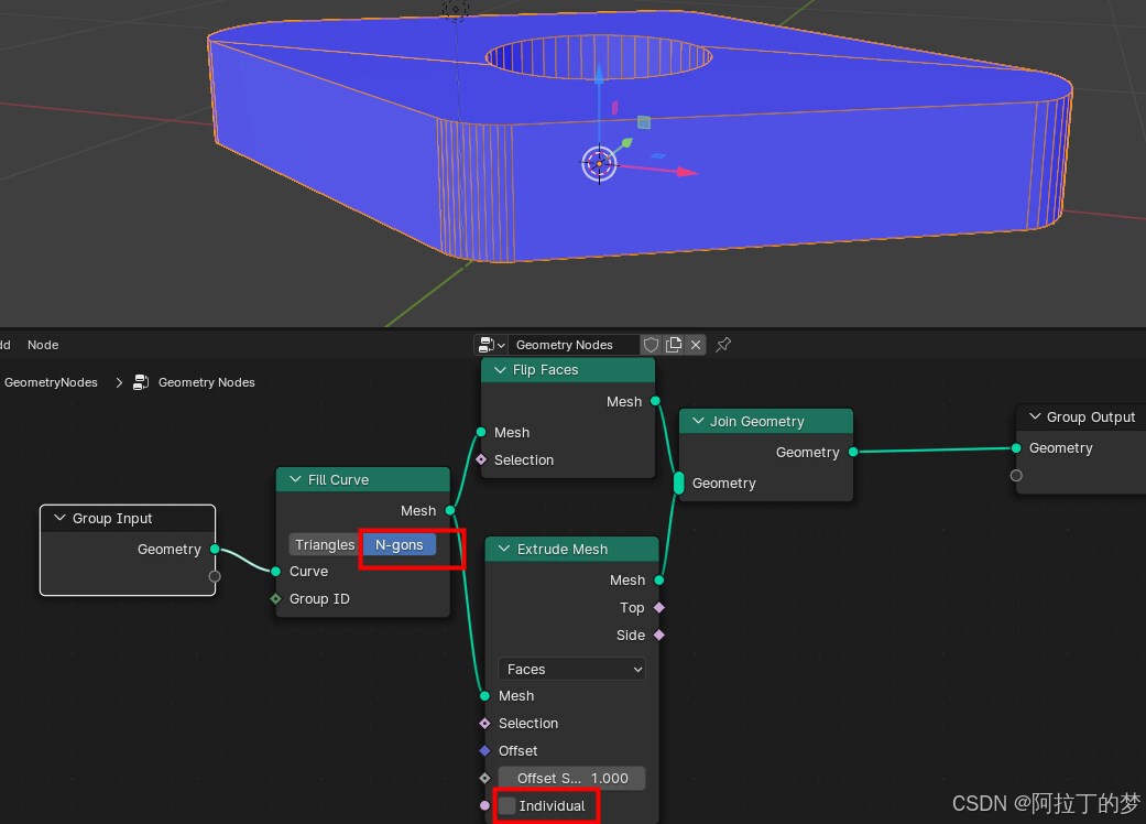 去掉连接部分,flip把下面的面翻转过来。加入join geometry。