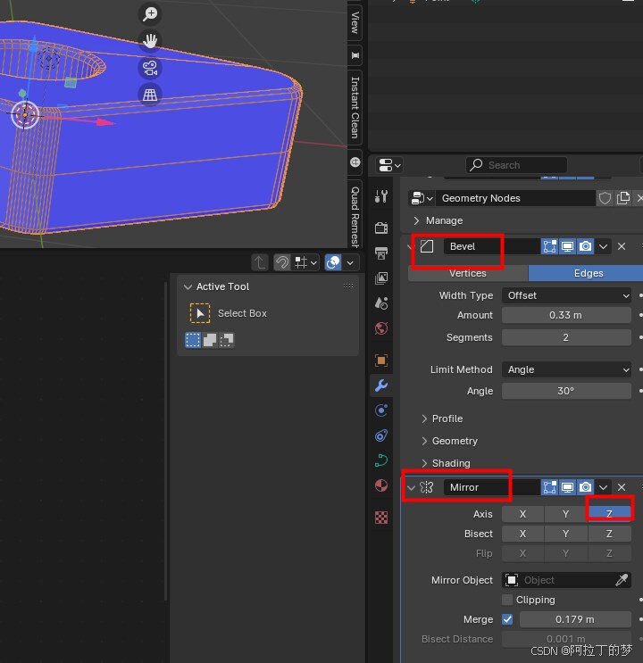 上面的fill face和join geometry都可以不要。先加bevel修改器,再加mirror修改器
