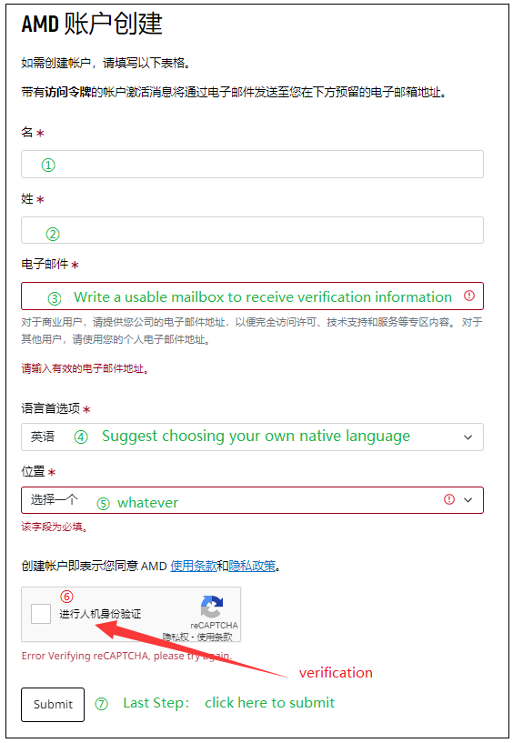 ③ 账户创建:填写姓名以及邮箱,这里填的邮箱是用来接收验证信息的,所以一定要填一个能用的邮箱。然后选择语言首选项和位置,上面的信息其实除了邮箱都可以随便填。最后进行完谷人机身份验证后,点击 Submit 提交即可。