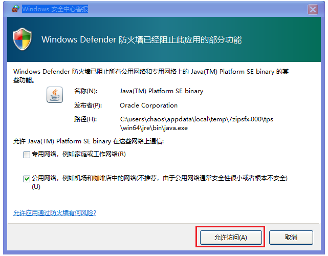 如果弹出 Windows 安全中心警报,点击 允许访问 即可: