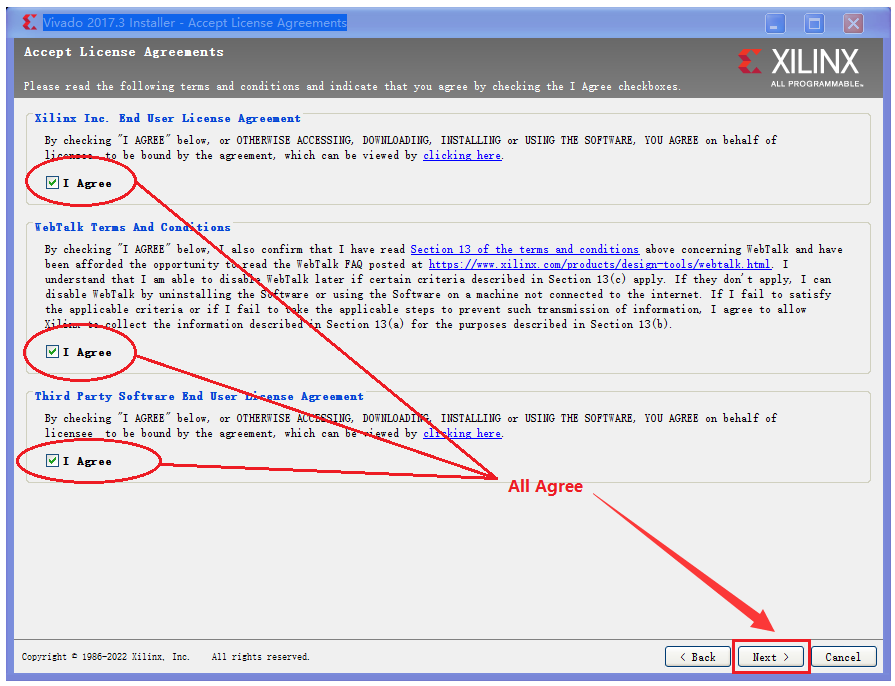 ⑤ 勾选同意:这三个条款全部勾选后才能选择 Next>