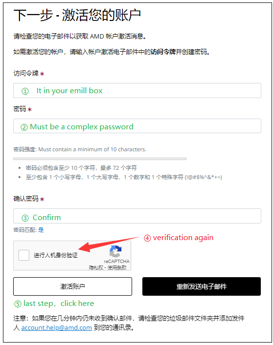 ④ 激活账户:访问令牌在你的邮箱中,如果你没有收到邮件,可以点击黑色按钮 "重新发送电子邮件"。 设置密码这块比较烦,长度必须包含10且需要包含 1个大写字母,1个小写字母,1个数字,1个特殊字符。这里不得不吐槽一下,是真的很麻烦。